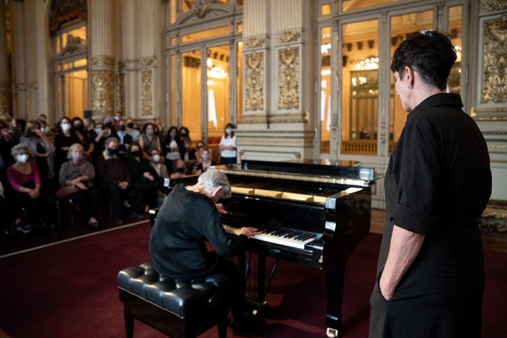 La primera performance presenta a la gran Margarita Fernández al piano, y en el Salón dorado del Teatro Colón, ni más ni menos. Mientras el público llega -en su mayoría mujeres, los varones prefieren eludir el tema-, Margarita pasa minuciosamente una pequeña franela sobre el piano. Una vez completada la limpieza, comienza a tocar. “Acá estoy, atardeciendo con Schumann” dice como introducción. Edgardo Cozarinsky había realizado un hermoso y vibrante retrato de esta intérprete y maestra en su documental Medium (2020), y a sus 95 años la artista sigue emocionando, vital. Margarita presenta una performance ensayo de Des Abends, de su favorito Schumann, en diversas ejecuciones, y de memoria: primero los graves, después la melodía pura, finalmente la frase completa. Sutil, cuidada, una versión de atardeceres, una lección de interpretación.