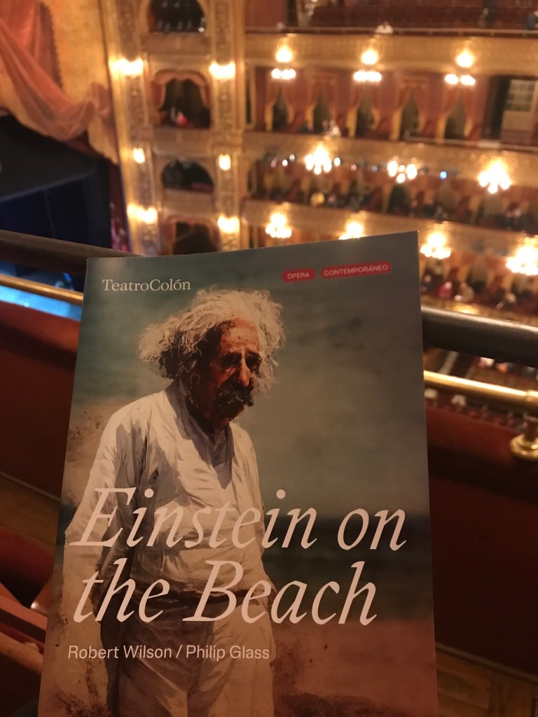 Hoy el Colón ofrece esta ópera abstracta en una versión dirigida por Martín Bauer, bastante fiel al original, aunque no copia la puesta de Wilson ni la coreografía de Lucinda Childs. Dos de las más grandes actrices de la escena en este momento, Analía Couceyro y Maricel Álvarez, recitan un texto en inglés junto al venezolano Iván García, un texto que repite una y otra vez frases que no siguen ninguna lógica, mientras en el foso, un conjunto de cuatro vientos, un violín eléctrico y sintetizador -todo amplificado- reitera frases musicales una y otra vez, junto a un coro que repite por ejemplo four-five-six-seven-eight o do-re-mi-fa-sol en continuidad. La música minimalista reduce sus elementos a lo esencial. Aunque parezca siempre la misma frase, que sigue un mismo patrón, sufre sutiles transformaciones de altura, de ritmo, de tono e intensidad. Hay que afinar el oído. Mientras esto ocurre, el escenario se va poblando y despoblando de estructuras metálicas, soportes, luminarias, rieles, una maqueta de Nueva York, y en la pantalla del fondo se proyectan imágenes varias, mientras Alejo Moguillansky filma el espectáculo. Se suceden diversos momentos musicales, los recitantes y bailarines con coreografías de Carlos Casella. Y siempre la música de Glass, que suena como los ángeles. No es fácil dirigir música minimalista, estructurada en base a repeticiones: Léo Warynski lo logra magistralmente, ayudado a veces con el conteo de su mano, para llevar registro de las repeticiones.
