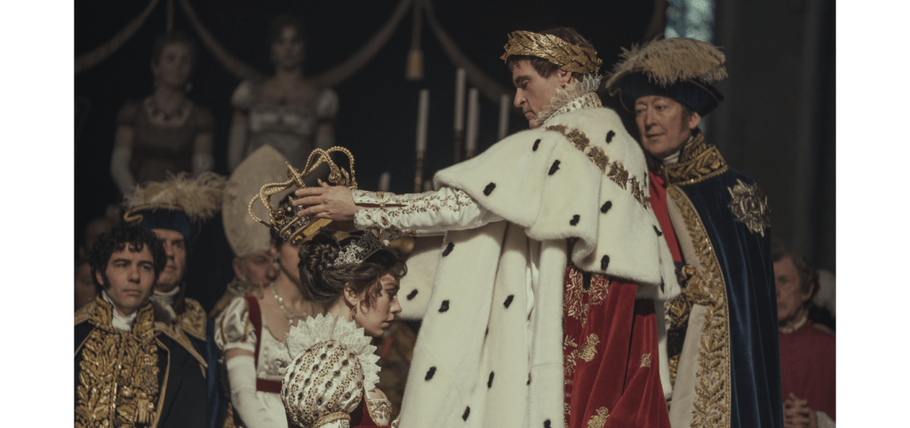 Joachim Phoenix cumple las consignas del director: jamás sonreír, comer mucho, parecerse a la iconografía del emperador. Hasta la escena de la coronación reproduce la pintura de Jacques-Louis David. La suya es una interpretación que bordea la parodia: basten sus juegos con el célebre sombrero, o los malabarismos que ejecuta para colocarse la corona por encima de los laureles. Su Napoleón es un empresario, un arribista que supo aprovechar sus oportunidades para llegar de teniente a emperador, para regresar triunfante del exilio y para aceptar la derrota con gracia. Pero a héroe le interesaba más su mujer que su imperio, por ella renuncia a culminar la conquista de Egipto, y por ella regresa del exilio.