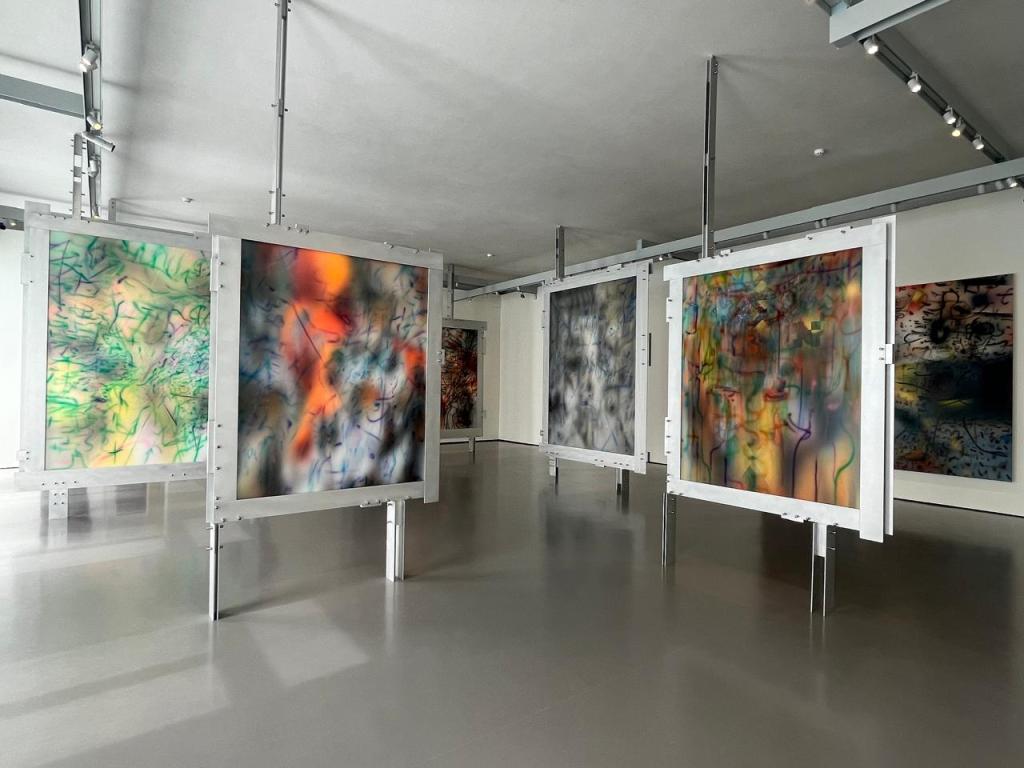 Por último, en la serie llamada TRANSpintings, Mehretu utiliza un soporte diferente: ya no es la tela, sino una malla de poliéster ligeramente transparente que permite que la luz atraviese la superficie y que el observador vea a través de ella las sombras de otros visitantes, reforzando la sensación de una presencia humana fantasmal. Están colocadas en soportes creados por la artista Nairy Baghramian, que actúan como marcos y como estructura, combinando pintura y escultura, invitándonos al movimiento. Son estructuras rectilíneas de aluminio, atravesadas por injertos metálicos, en las que sorprende el contraste. Si bien están pintadas solo por un lado, estas estructuras permiten observarlas desde ambos lados, creando juegos de reflejos y translucidez.